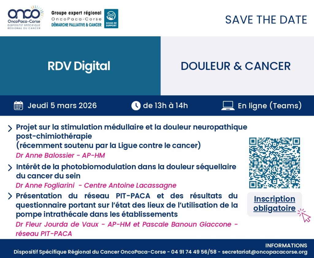 Le Dispositif Spécifique Régional du Cancer OncoPaca-Corse organise le jeudi 5 mars 2026 de 13h à 14h, un RDV Digital en visioconférence (Teams), sur la thématique Douleur & Cancer.
