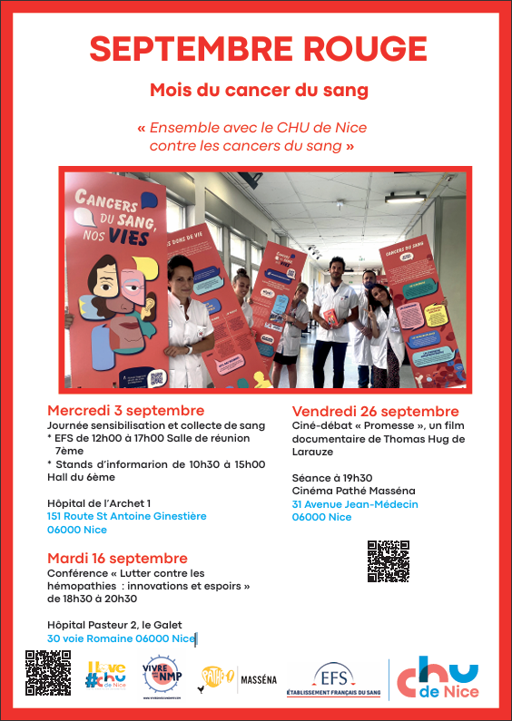 Au-delà des actions portées par le CHU de Nice et le Centre Antoine Lacassagne, d’autres établissements de santé autorisés au traitement des cancers hématologiques s’associent à la dynamique de Septembre en Rouge. Pour en savoir plus, consultez le programme sur le site de l’association Vivre avec une NMP.