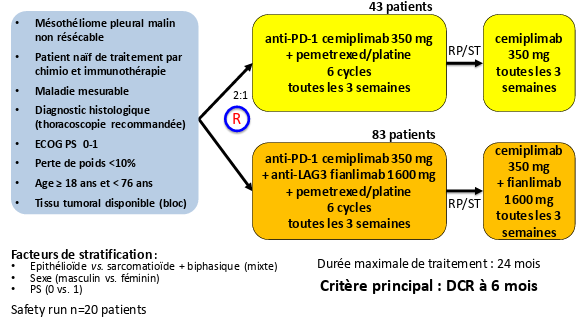 Essai de phase IIR non-comparatif évaluant le fianlimab en association avec le cemiplimab et une chimiothérapie platine-pemetrexed ou le cemiplimab et une chimiothérapie platine-pemetrexed chez des patients naïfs de traitement présentant un mésothéliome pleural