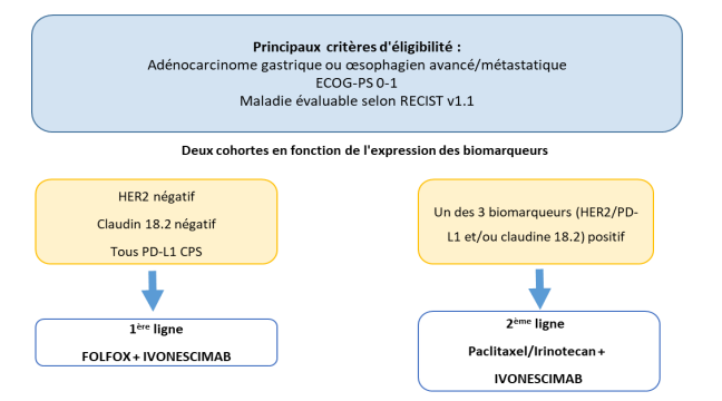 - Pour les patients sans biomarqueur actionnable (HER2 et Claudin 18.2-négatifs) à l’exception de PD-L1, pas de traitement antérieur pour une maladie avancée (cohorte 1). Pour les patients présentant au moins un des biomarqueurs actionnables suivants (PD-L1 CPS≥1, et/ou HER2-positif, et/ou Claudin 18.2-positif), une seule ligne de traitement préalable pour une maladie avancée (cohorte 2).