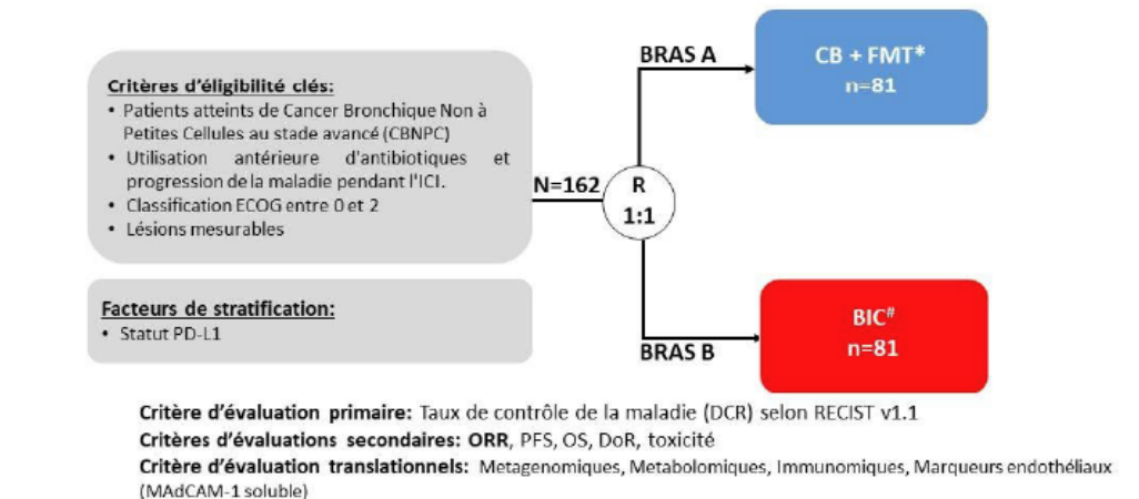Etude randomisée multicentrique de phase II évalunat la microbiothérapie fécale poolée par voie orale (MAAT033) concomittante au cemiplimab (CB) comparée au meilleur choix du médecin dans la résistance au blocage PD-1/PDL-1 en raison de la prise d’antibiotiques chez les patients avec un cancer bronchique non à petites cellules avancé