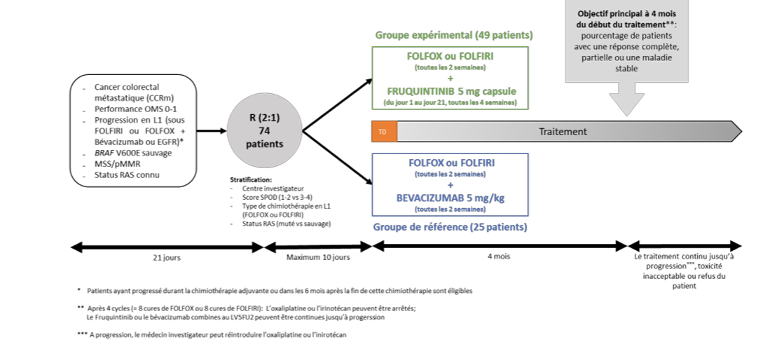 FOLFOX/FOLFIRI + Bévacizumab ou Fruquintinib en 2ème ligne du Cancer Colorectal métastatique (CCRm) : essai de phase II randomisée non comparative